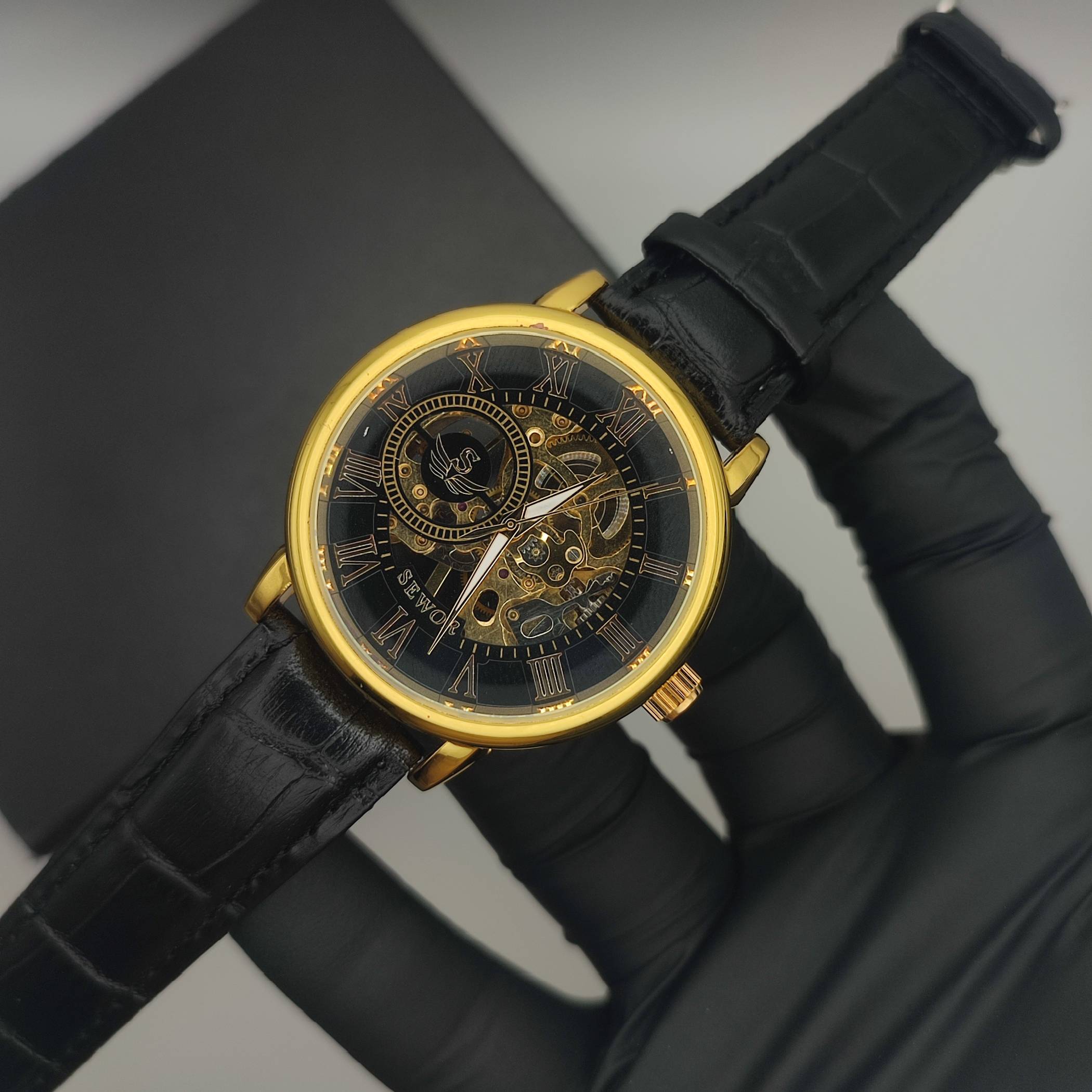 Luxury Mechanical Design – Experience the art of precision with the Sewor Skeleton Automatic Watch. Its open-worked dial reveals the intricate inner mechanism, allowing you to witness time in motion. The blend of black and gold tones radiates sophistication and timeless elegance, making it a bold statement piece for every gentleman.