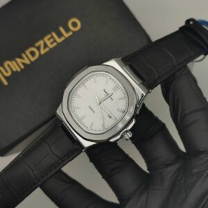 Luxurious Silver Watch with Black Leather Strap ( white )